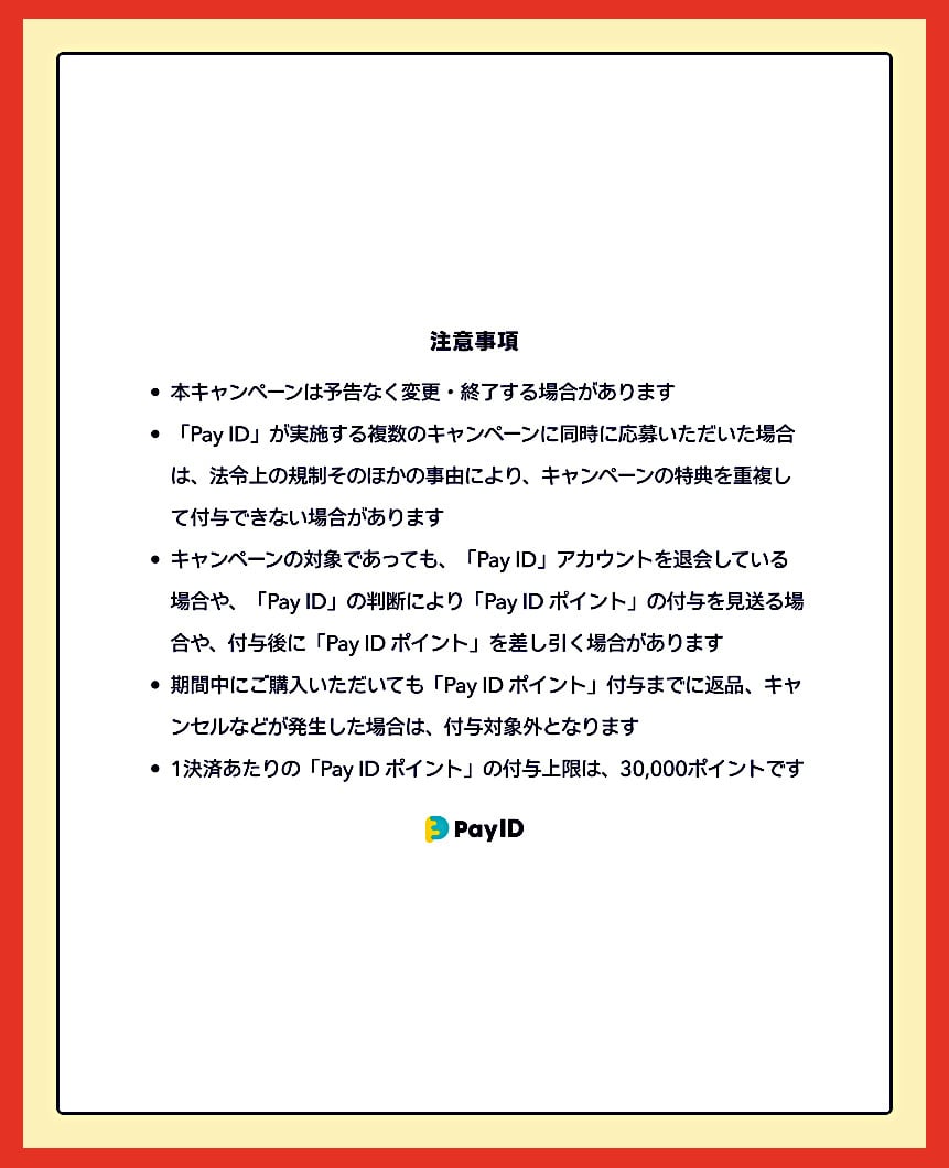 キャンペーンの対象であっても、「Pay ID」アカウントを退会している場合や、「Pay ID」の判断により「Pay ID ポイント」の付与を見送る場合や、付与後に「Pay ID ポイント」を差し引く場合があります